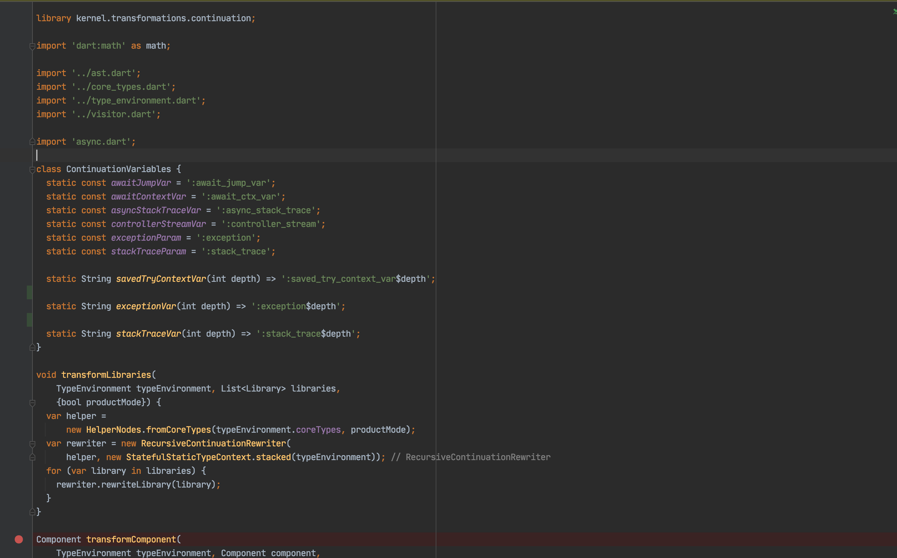 The async and await in Dart are syntax sugars in themselves, which are not mechanisms that can be directly used at the bottom by writing down. In fact, they are supported by generating holes in the Dart layer code. In the Dart pkg/kernel/transformations/continuations.dart, we can see how this syntax sugar is expanded by Transformer in the Kernel layer:
